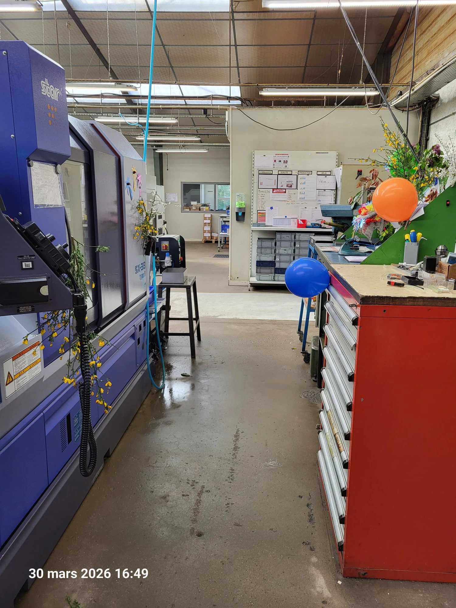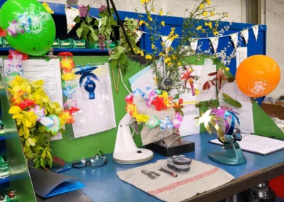Pour son dernier jour, comme un air de fête, avec son poste de travail décoré puis la création d’un collier de pièces usinées qui lui a été concocté. Et la remise d’un beau Bouquet de fleurs par la direction.